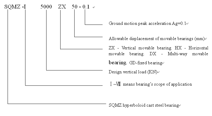 1. Bearing configuration: In terms of performance, SQMZ bearings are divided into 4 kinds- Vertical movable bearing, horizontal movable bearing, multi-way movable bearing and fixed bearing. It includes upper bearing plate (including plane stainless steel plate), convex hyperboloid liner (including plane PTFE plate), lower bearing plate (including curved surface PTFE plate), bearing anchor bolt, connecting plate and coaming.
