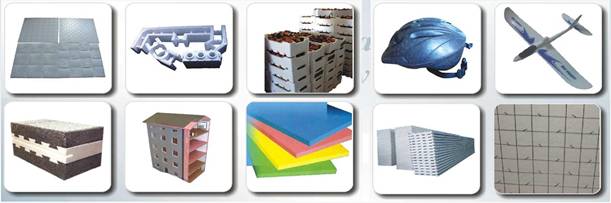 The finished products which have a huge application in package and construction, such as vegetable and fish box, electronic parts package, wall and roof insulation, concrete foam, house decoration and so on.